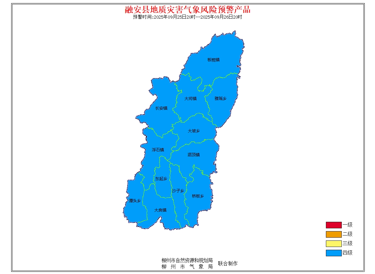 地质灾害气象风险预警信息:预报2025年9月25日20时-2025年9月26日20时,根据未来24小时降雨及前期降雨实况,结合地质环境条件分析,柳州市地质灾害预警等级为蓝色预警(四级),气象因素等致地质灾害发生有一定风险。