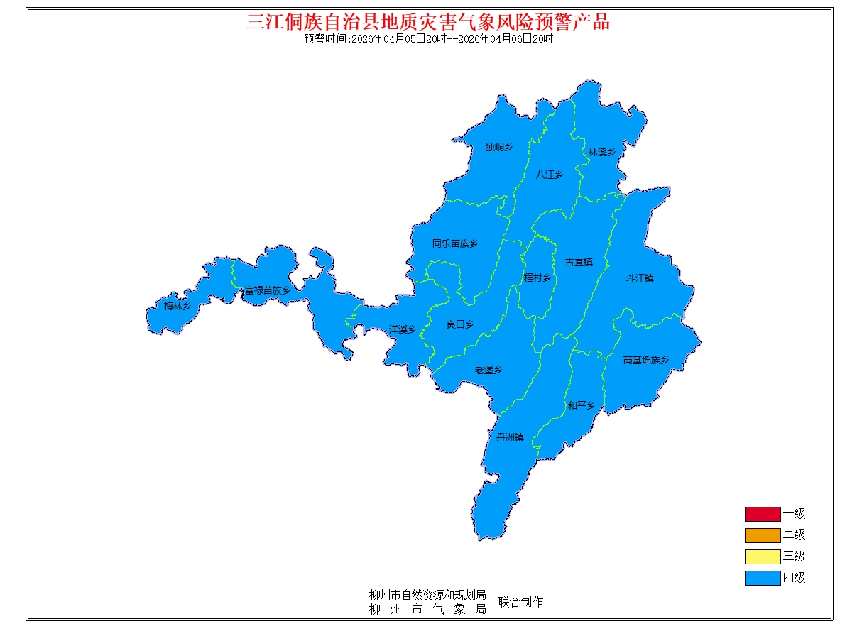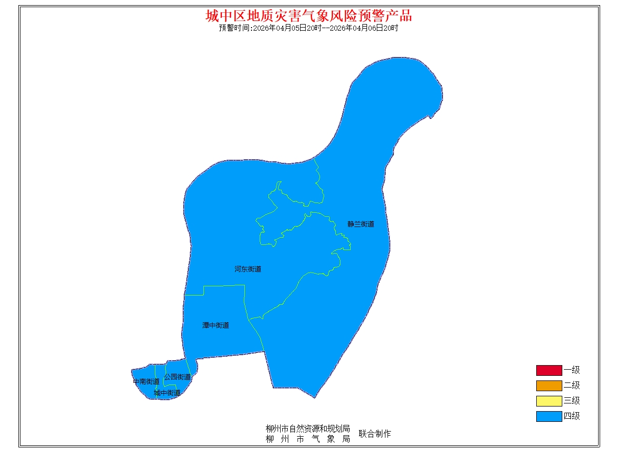 地质灾害气象风险预警信息:预报2026年4月5日20时-2026年4月6日20时,根据未来24小时降雨及前期降雨实况,结合地质环境条件分析,柳州市地质灾害预警等级为蓝色预警(四级),气象因素等致地质灾害发生有一定风险。