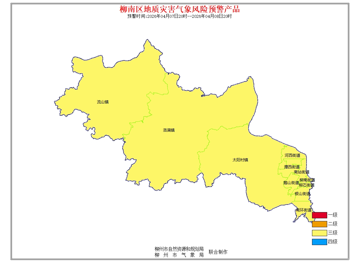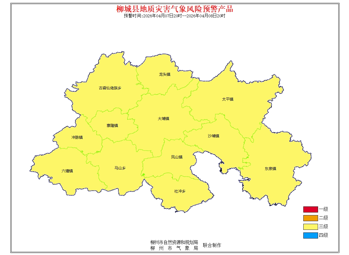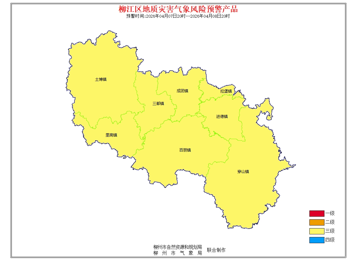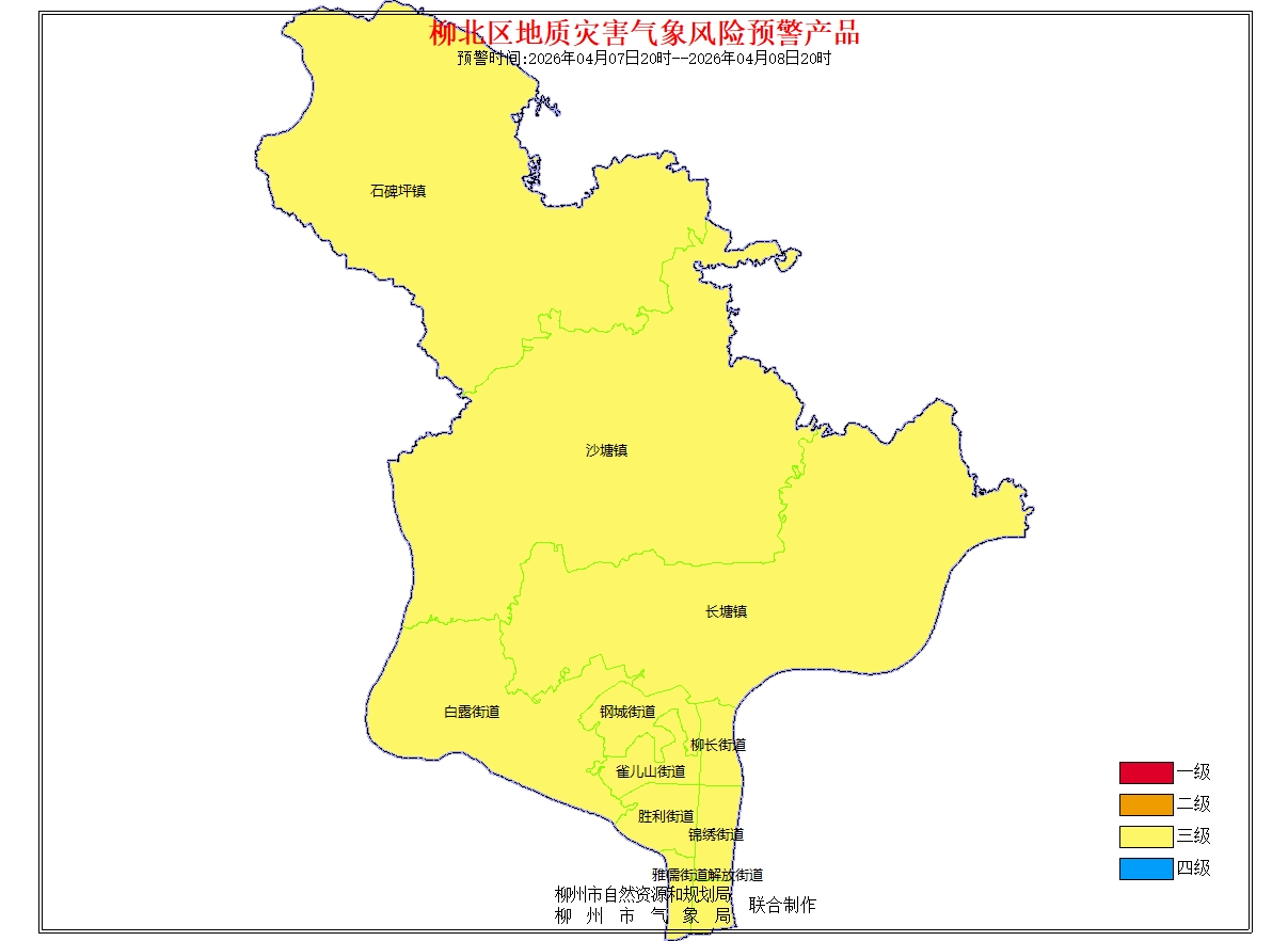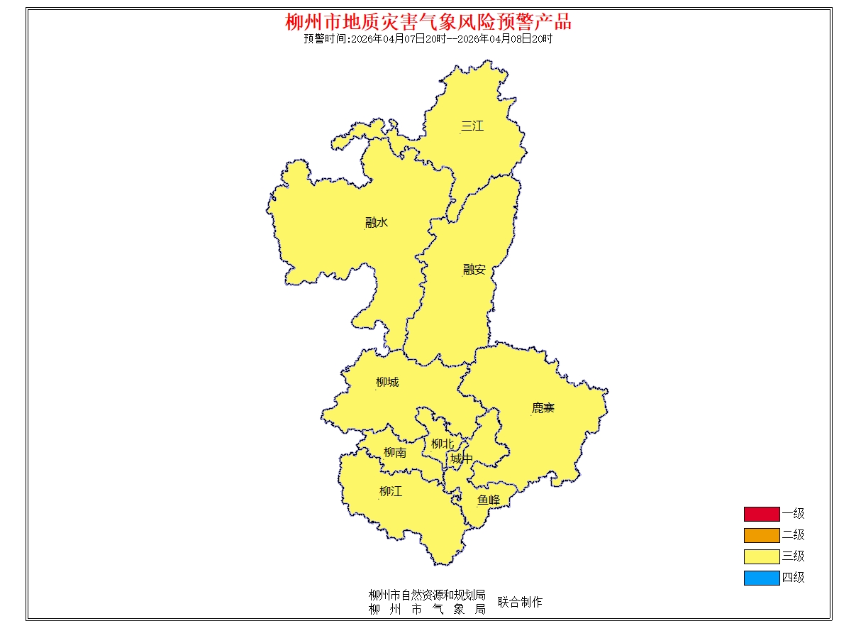 地质灾害气象风险预警信息:预报2026年4月7日20时-2026年4月8日20时,根据未来24小时降雨及前期降雨实况,结合地质环境条件分析,柳州市地质灾害预警等级为黄色预警(三级),气象因素等致地质灾害发生风险较高。请注意做好地质灾害防范工作。(测试短信)