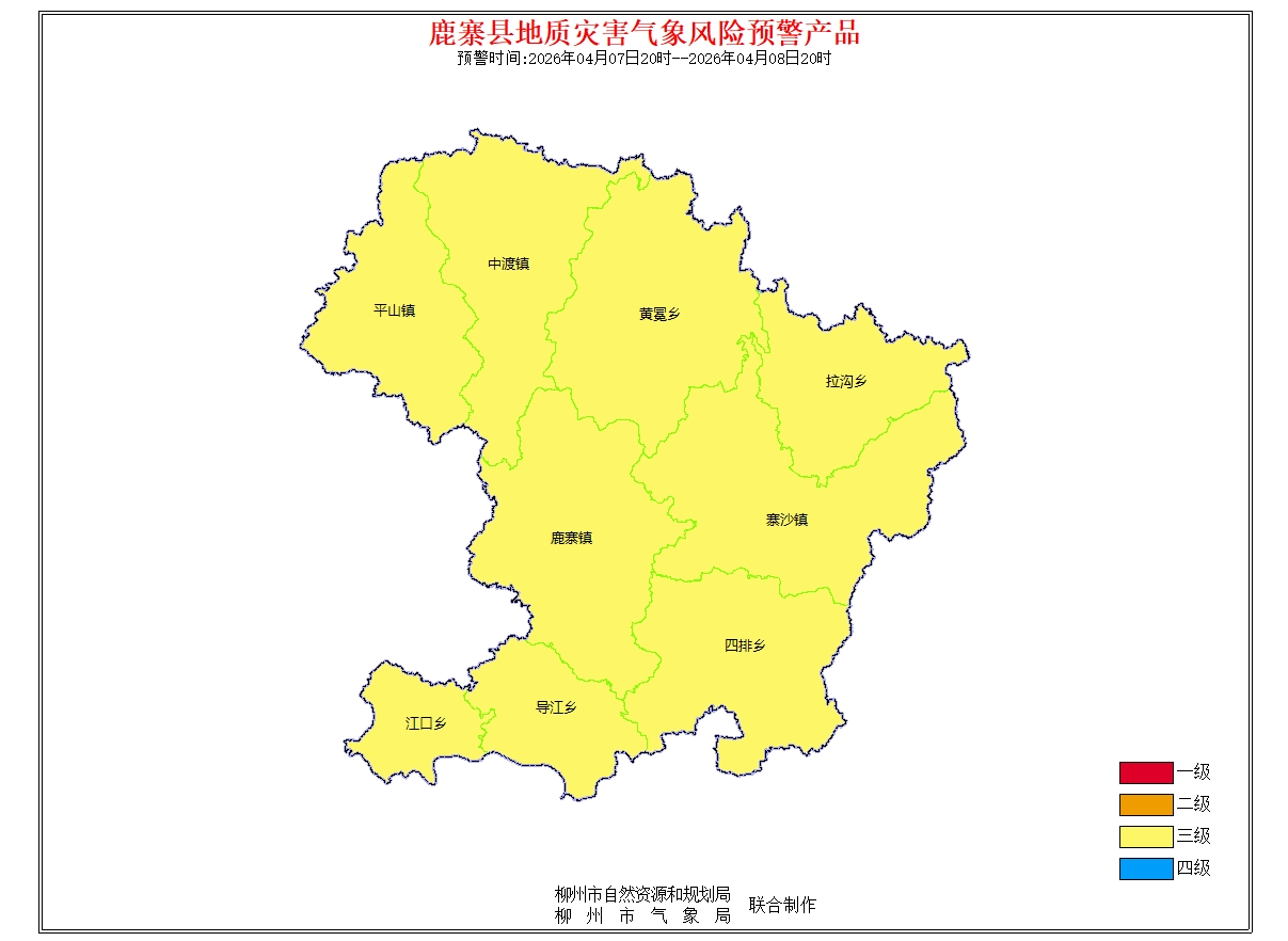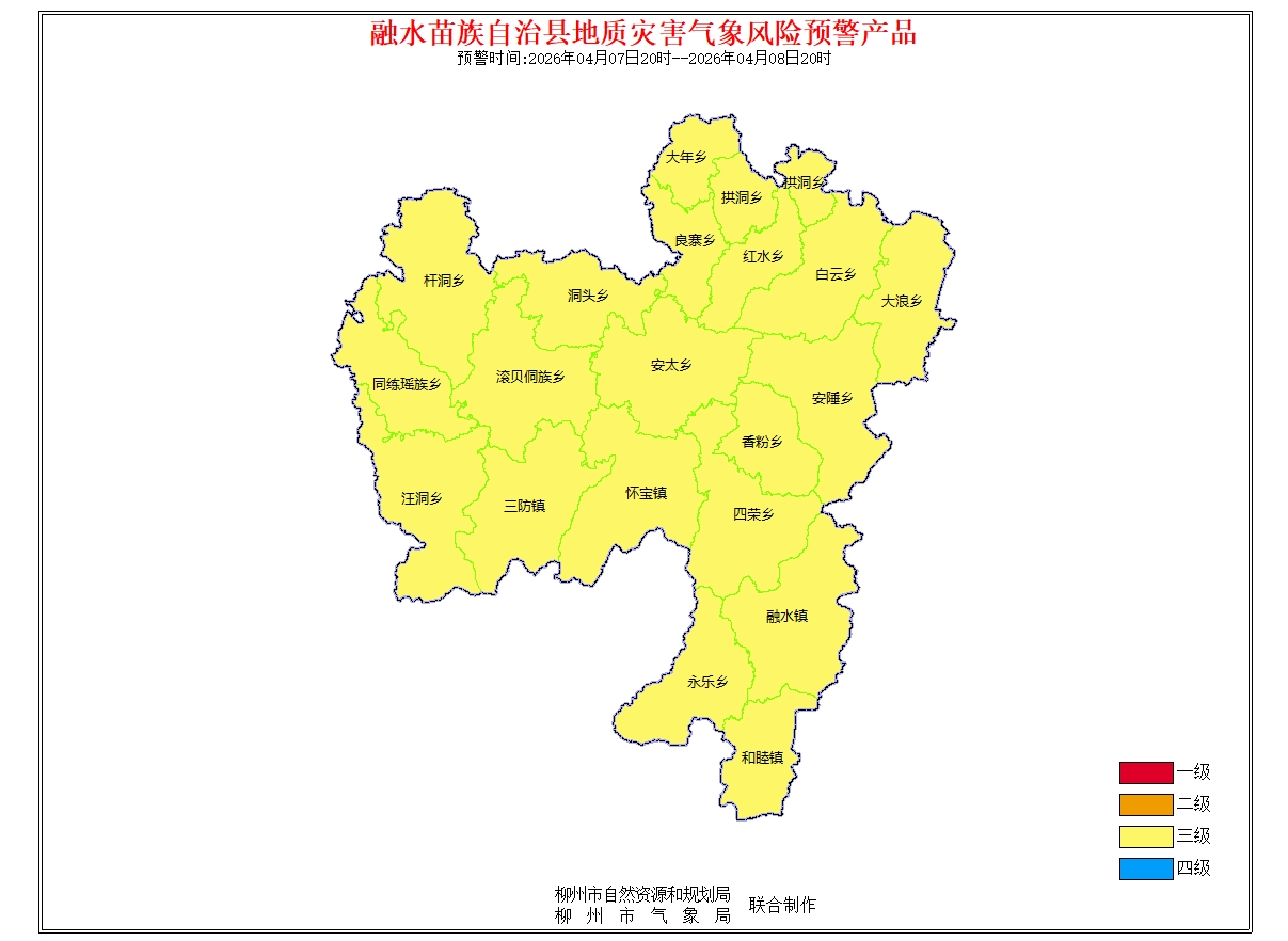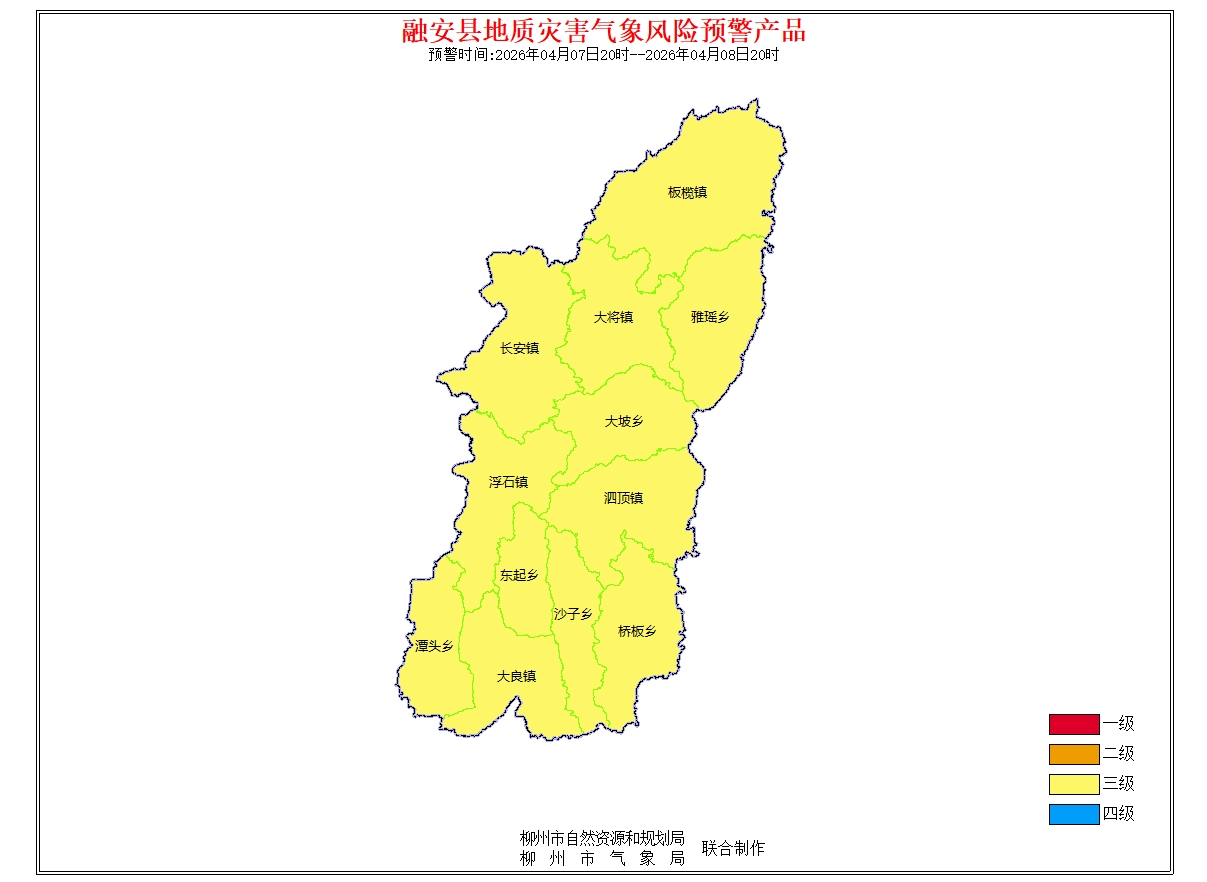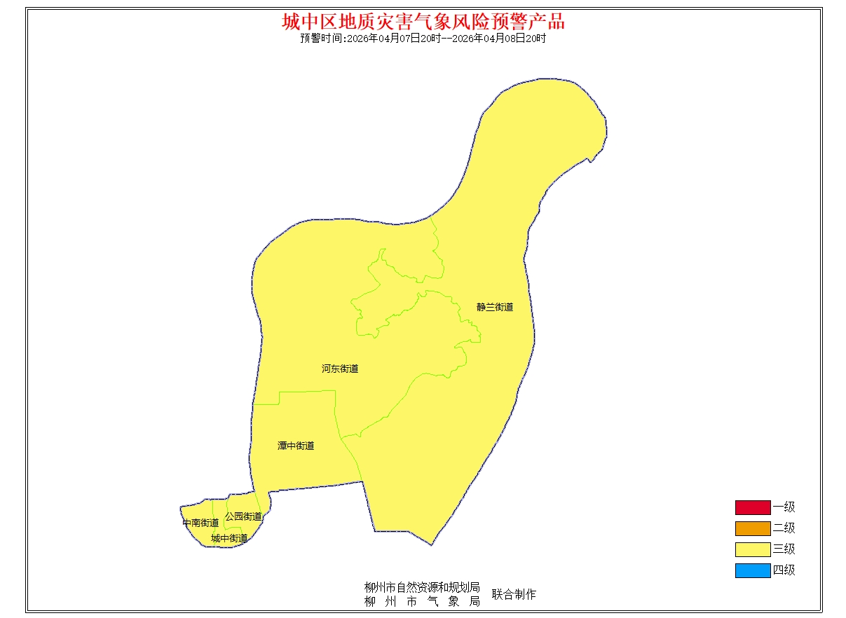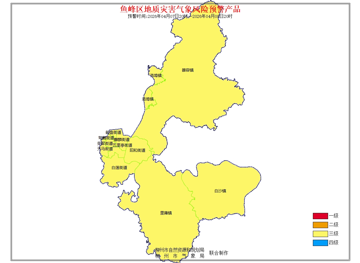 地质灾害气象风险预警信息:预报2026年4月7日20时-2026年4月8日20时,根据未来24小时降雨及前期降雨实况,结合地质环境条件分析,柳州市地质灾害预警等级为黄色预警(三级),气象因素等致地质灾害发生风险较高。请注意做好地质灾害防范工作。(测试短信)