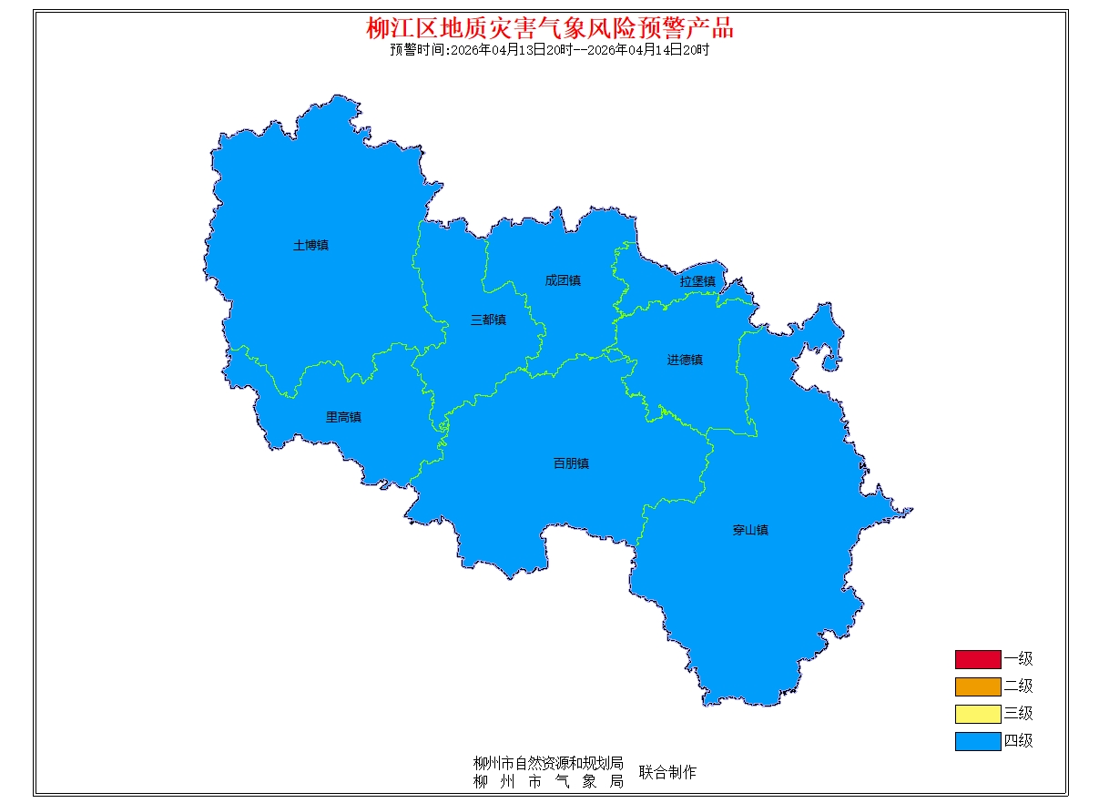 地质灾害气象风险预警信息:预报2026年4月13日20时-2026年4月14日20时,根据未来24小时降雨及前期降雨实况,结合地质环境条件分析,柳州市地质灾害预警等级为蓝色预警(四级),气象因素等致地质灾害发生有一定风险。