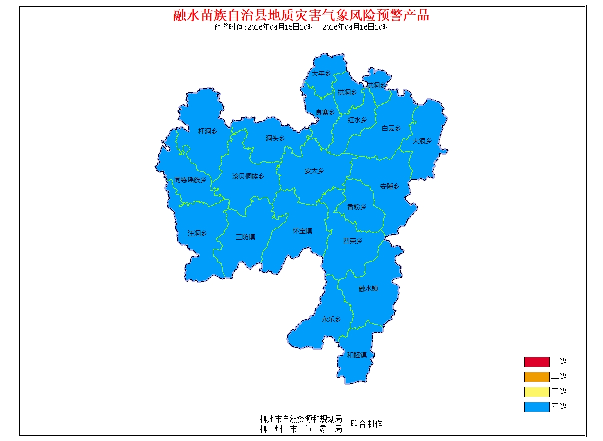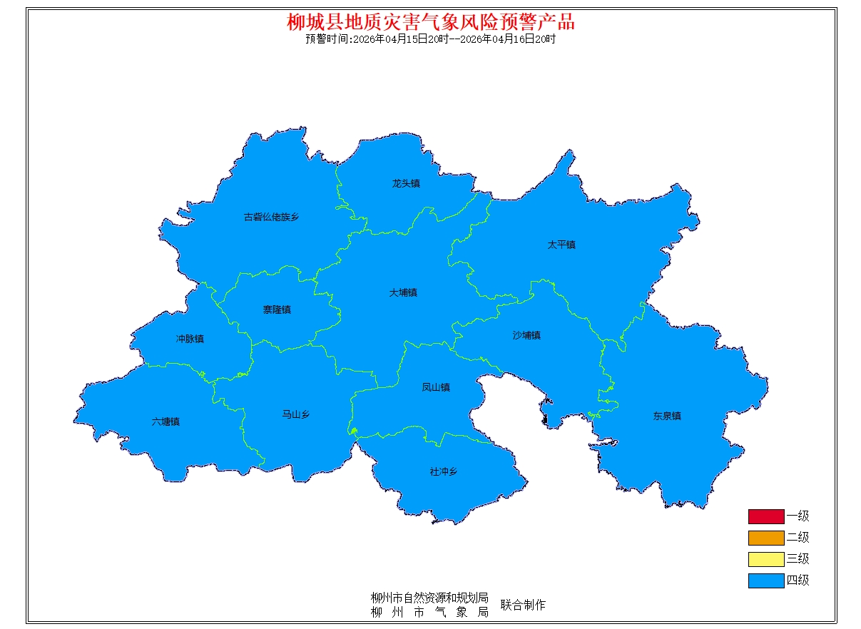 地质灾害气象风险预警信息:预报2026年4月15日20时-2026年4月16日20时,根据未来24小时降雨及前期降雨实况,结合地质环境条件分析,柳州市地质灾害预警等级为蓝色预警(四级),气象因素等致地质灾害发生有一定风险。
